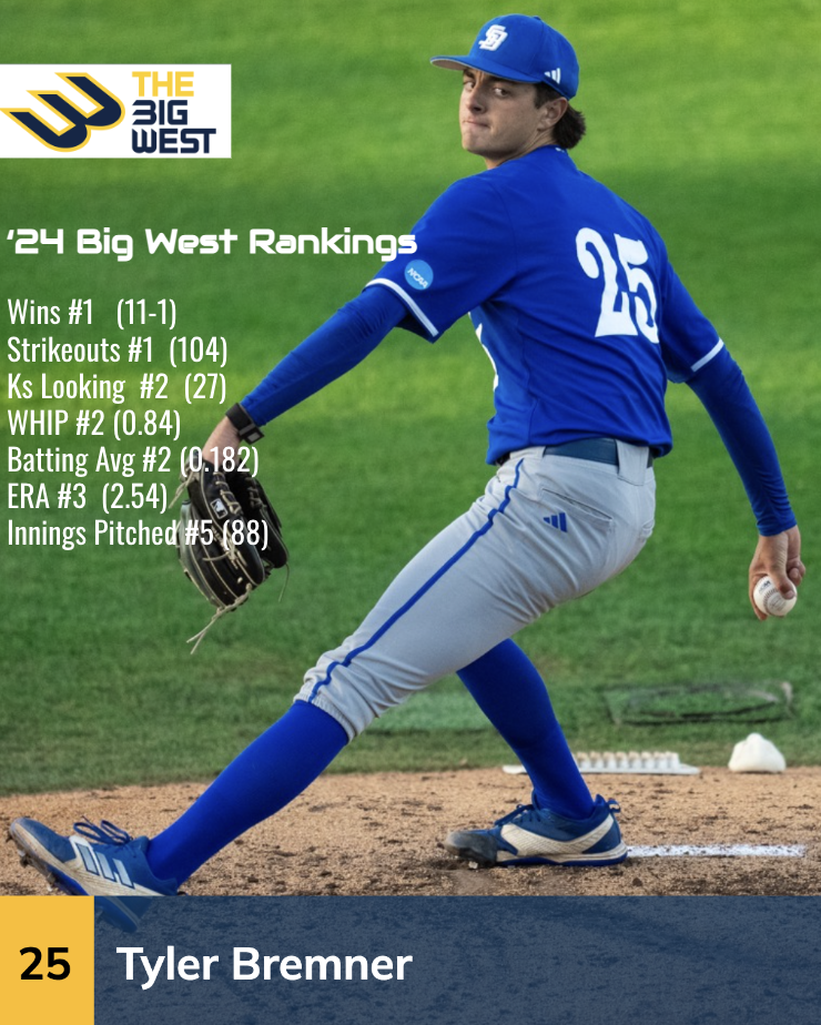 In his first two years at Santa Barbara, Bremner has slid back and forth between starting and relieving, finding success in both roles in 2024 to put up gaudy numbers. He began the year in the rotation but moved to the bullpen when Hudson Barrett got hurt. He was back in the rotation when Matt Ager struggled, helping the Gauchos reach (and host) a Regional.