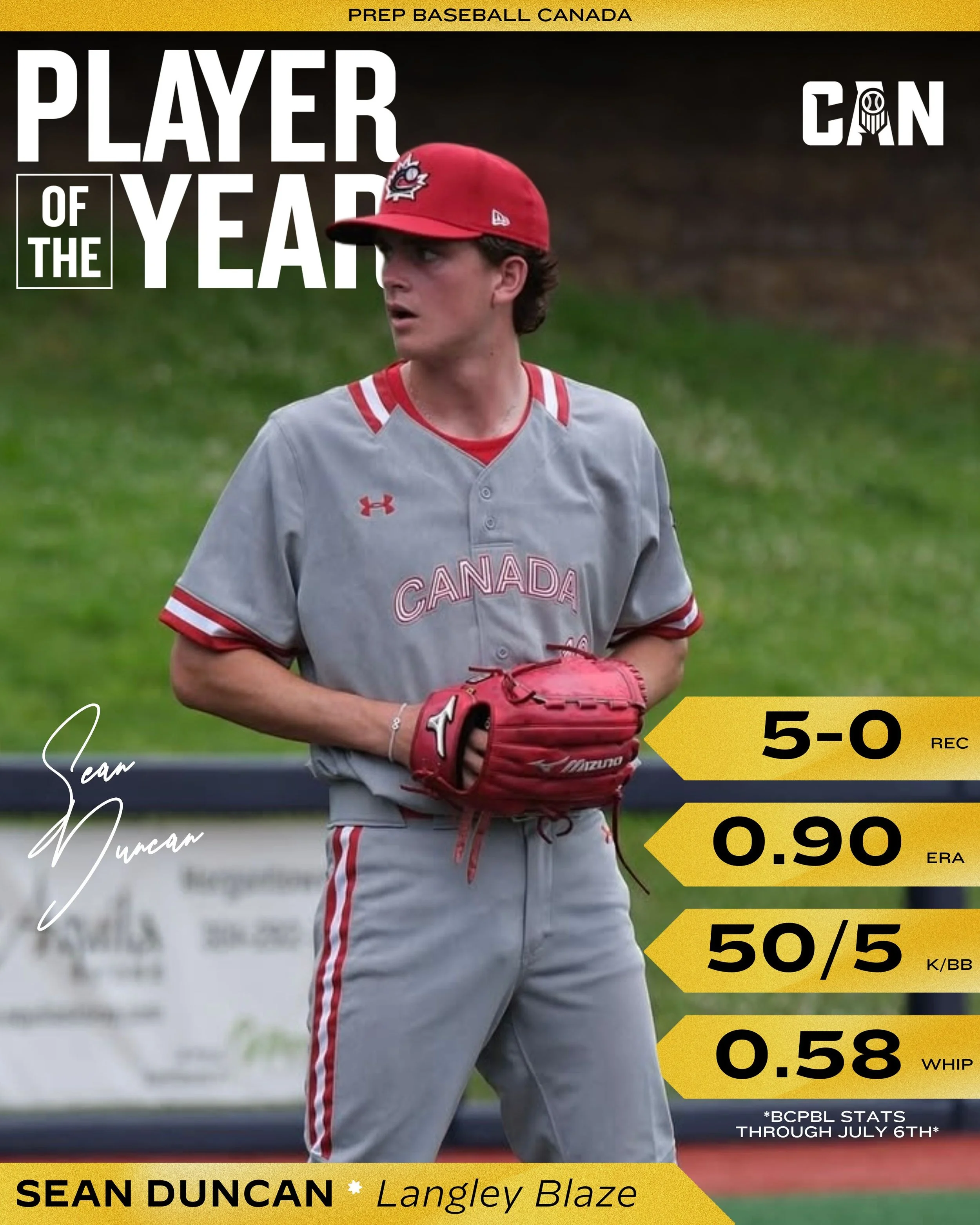 2024 season with Junior National Team in Fall Instructional league in Florida _ Four scoreless against Giants worked four scoreless, walking one and fanning seven ... Against the Brewers, pitched four scoreless, walking two, allowing three hits and striking out two ... Dominican Pro Tour _ Pitched three scoreless against Astros Dominican Summer League Astros allowing one hit and one walk, while striking out fou ... Against Dodgers DSL allowed two runs on two hits and one walk in three innings, as he struck out six ... Extended Spring Training _ Worked three innings against Toronto Blue Jays giving up two runs on three walks and four hits, as he struck out four ... Facing the Blue Jays again he pitched three scoreless giving up two hits and a walk ... ... Recorded a win and a save in two pitching appearances at the WBSC Americas U18 World Cup qualifier in Panama. He allowed seven hits and three earned runs while striking out nine batters in 8 2/3 innings as Canada finished fifth ,,, Summer of 2025 with Langley _ 5-0 record with 0.90 ERA in 31 innings in BC Premier League. Had 50 strikeout to five walks, holding opponents to a .126 average ... Pitched three scoreless, hitless innings at the Rogers Centre in the Toronto Blue Jays’ 10th annual Canadian Futures Showcase of top high schoolers from across the country.