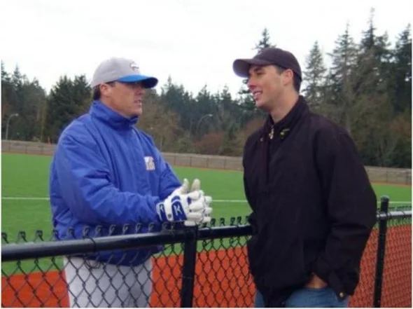 *Jeff Francis (right) stops by a University of British Coilumbia Thunderbirds workout to chat with his former coach Terry McKaig. Photo: Robert Broughton. ....