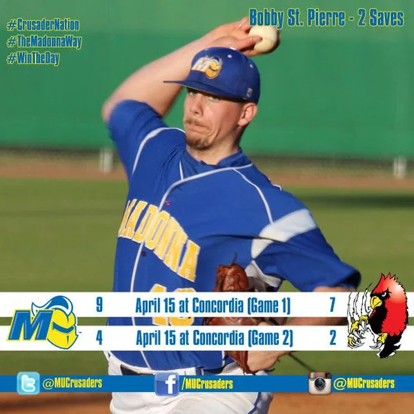 St. Pierre earned second team honourss with a WHAC-leading 13 saves which ranked first all-time in a single season in MU baseball history. He was named to the All-Academic team and earned a spot among the Daktronics-NAIA Scholar-Athletes along with teammates Ryan Freemantle (Georgetown, Ont.) Levi Larmour (Oakville, Ont.) and Adam Prashad (Mississauga, Ont.). St. Pierre walked seven and fanned 23 with a 1.31 ERA collecting his 13 saves in 22 games. He walked seven and fanned 23 in 20 2/3 innings, holding opponents to a .171 batting average. His saves were second highest by Canadians and he had the third lowest ERA.