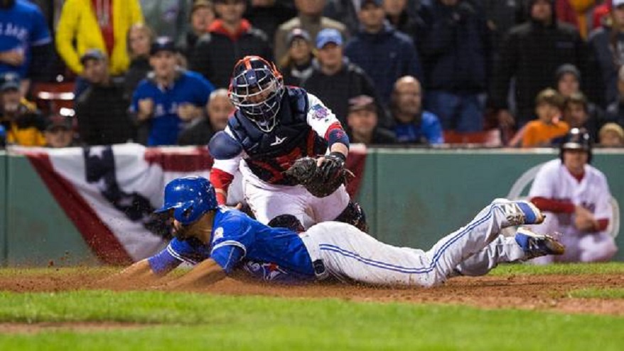 Pinch runner Dalton Pompey (Mississauga, Ont.) slides home with the winning run in the ninth Saturday night in Boston to keep the Jays wild-card hopes alive.