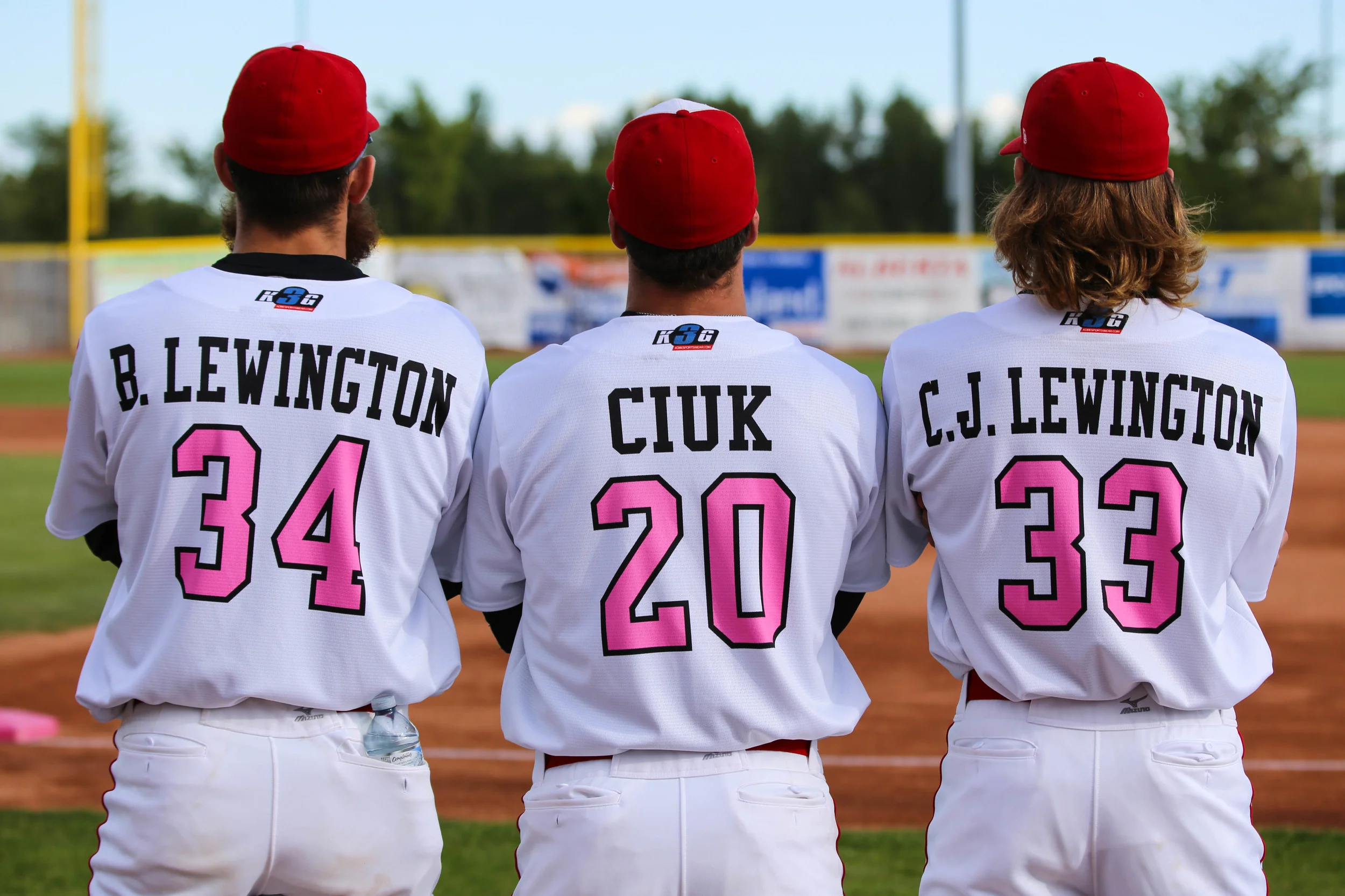 Bo Lewington (Calgary, Alta.), Garrett Ciuk (Misson College) and C.J. Lewington (Calgary, Alta.) before beating the Edmonton Prospects and auctioning the shirts off their backs for breast cancer research. Photos: Amanda Fewer.