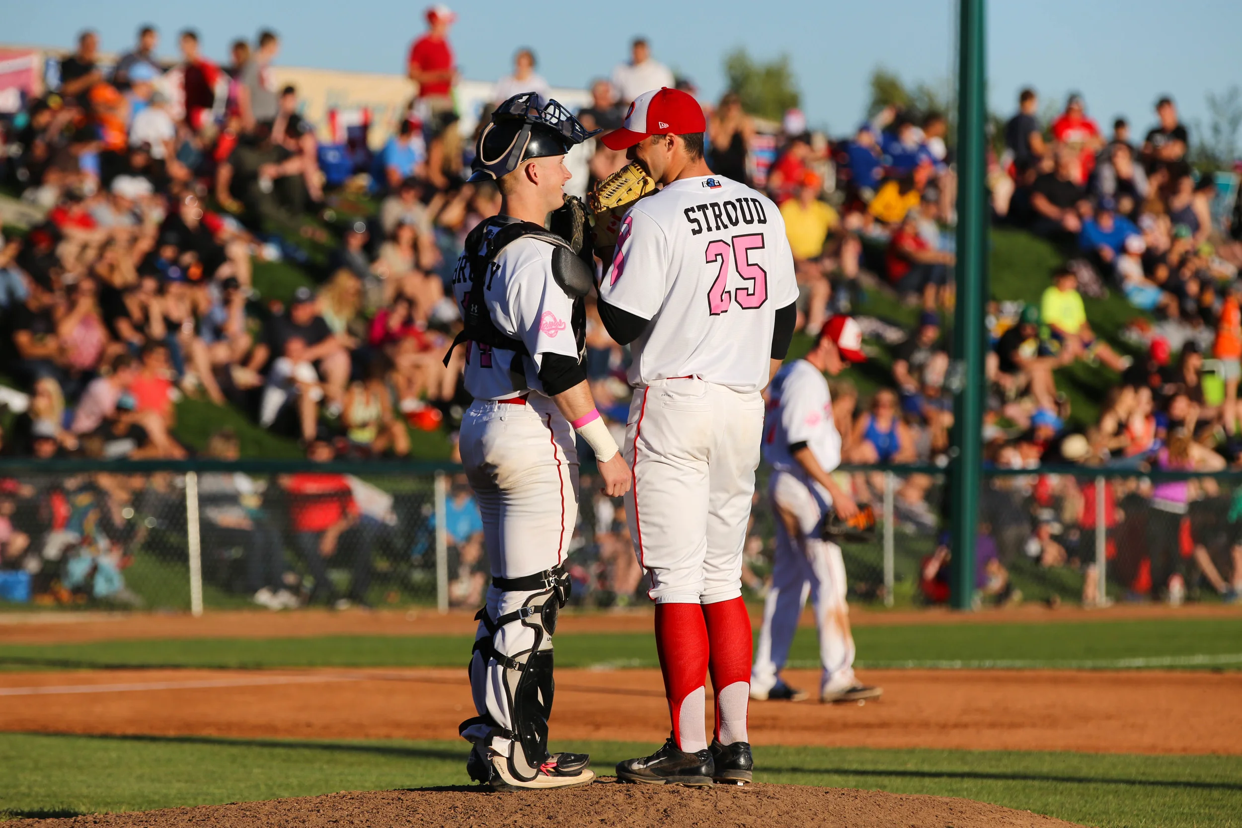 C Joel Brophy (Burlington, Ont.) pays a mound visit to winning pitcher RHP Liam Stroud (Maple Ridge, BC)