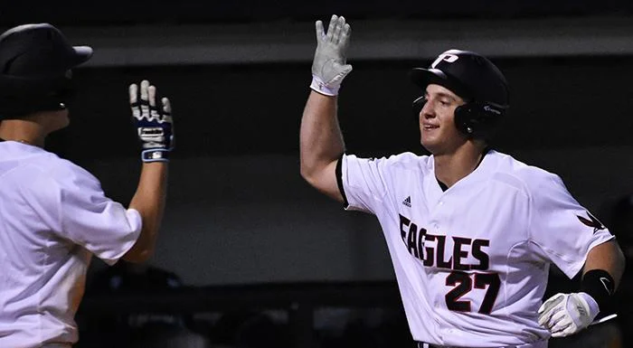 OF Zach Diewert (Chemainus, BC), No. 27, of the Polk State College Eagles will be with the Victoria HarbourCats of the West Coast League next summer. Photo: Tom Hagerty, Polk State.