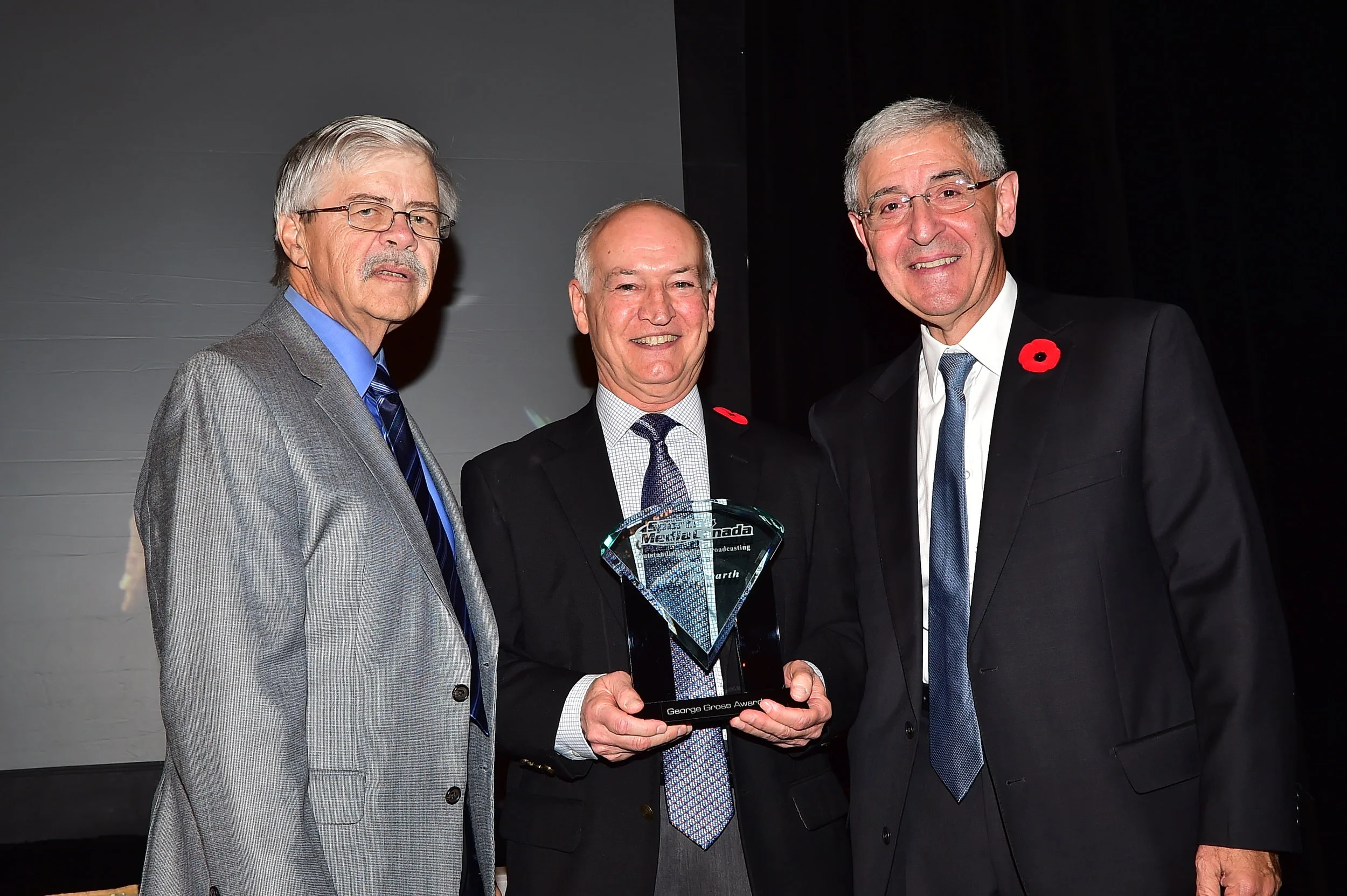 John Iaboni, right) presents Jerry Howarth with the Spports Media Canada George Gross award.