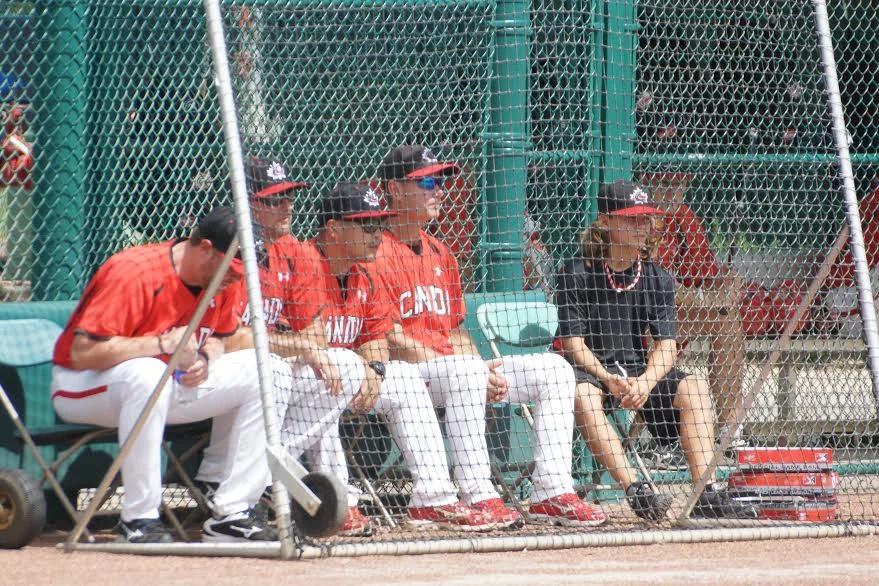 Canadian Junior coaches, from left to right, T.J. Burton (Ottawa, Ont.), Mike Johnson (Sherwood Park, Alta.), Hyung Cho (Toronto, Ont.), head coach Greg Hamilton (Ottawa, Ont.) and Ty “Colby Rasmus” Hamilton, the bat boy. Photo: Eddie Michels.