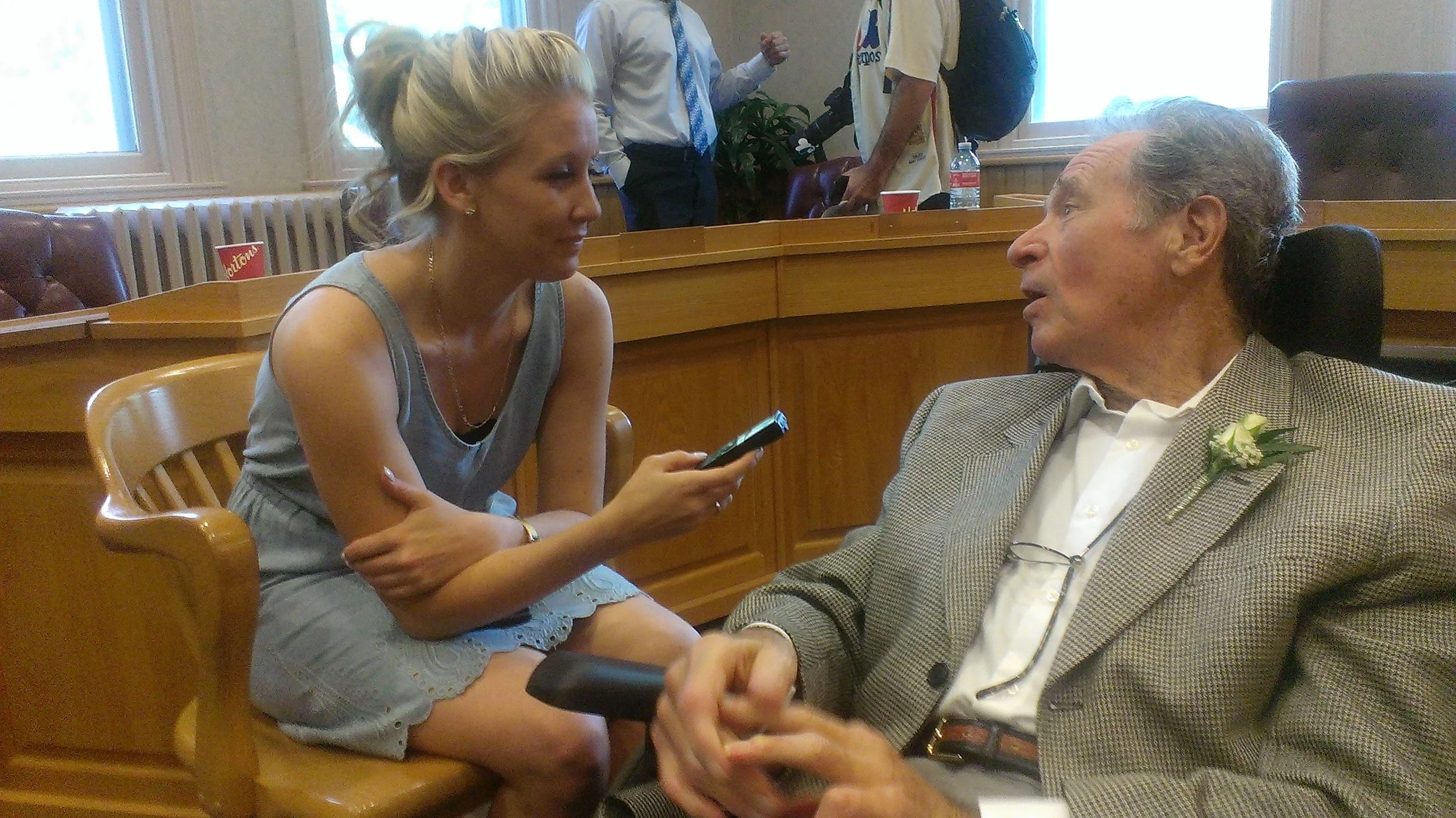 Alexis Brudnicki of the Canadian Baseball Network interviews Wayne Norton (Port Moody, BC) Saturday, induction day in St. Marys. Photo: Danny Gallagher.