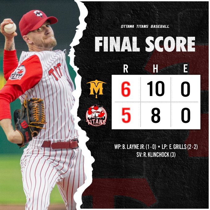 Ottawa, Ont. - The Ottawa Titans (23-8) saw their five-game winning streak come to an end, surrendering a late three-run lead to drop the opener of their three-game series with the Sussex County Miners by a 6-5 final on Tuesday night.
