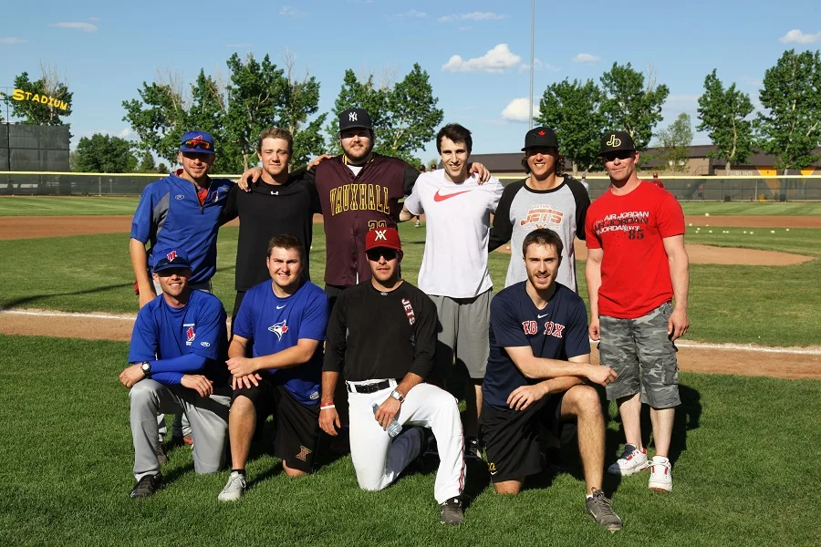 Home run derby contestants: Back _ Austin Schibler, Bryce Fraser, Greg Adams, Jeremie Fagnon, Brett Resch and Dave Ruhr; Front _ Skylar Strosmoe, Jordan Malainey, Joel Blake and Brendan Hendriks.