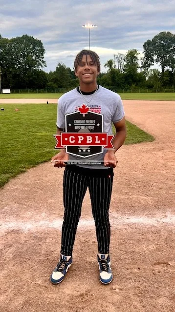 Ontario Blue Jays switch-hitting slugger Mikey Batiste holds the CPBL championship trophy that his 14U team won in 2024.