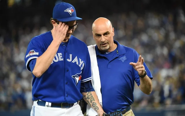 RP Brett Cecil is walked off the field by Blue Jays trainer George Poulas after tearing his calf in the eighth inning.