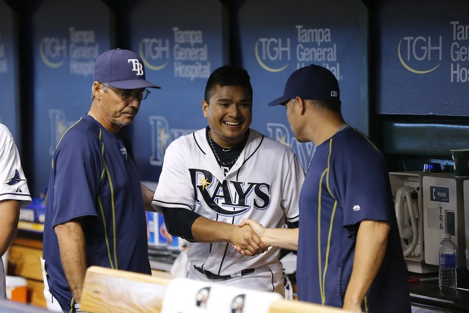 RHP Erasmo Ramirez (middle) shakes hands with Tampa Bay Rays manager Kevin Cash after pitching 7 2/3 scoreless (one single) against the New York Yankees in September. Photo: George Pappas.