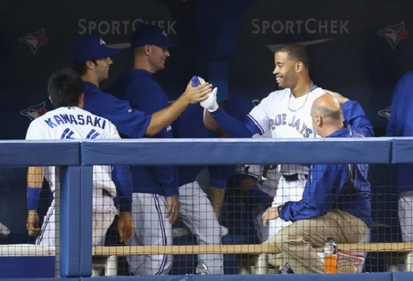 Dalton Pompey, Oakville Royals grad, is congratulated in the dugout after hitting his first homer … and he he hit off former Cy Young award winner Felix Hernandez of the Seattle Mariners.