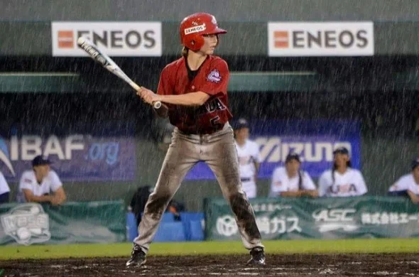 2B Nicole Luchanski (Edmonton, Alta.) is a woman for all seasons shown here hitting in the wet of the Worlds championship at Miyazaki, Japan. Luchanski has had help on her way to the Pan Am Games this summer in July. Photo: Alexis Brudnicki.