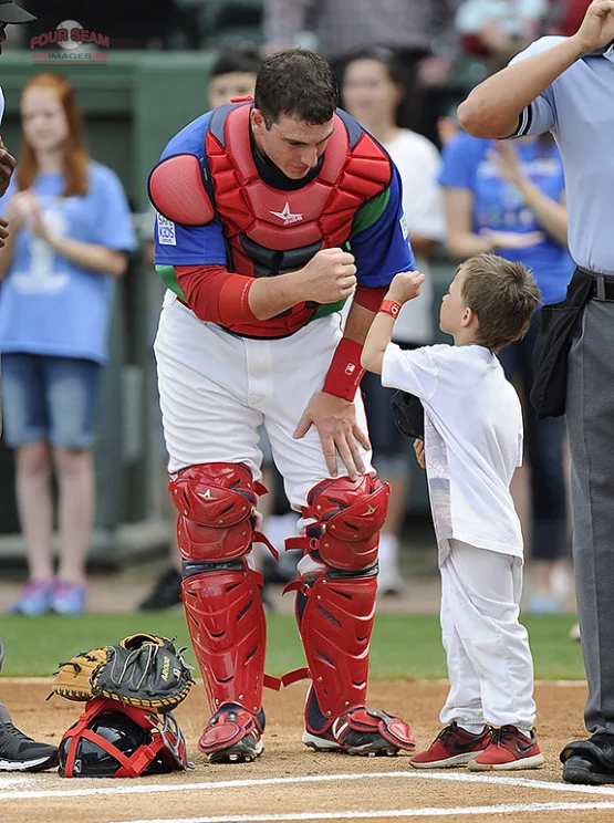 C Jordan Procyshen (Oktoks, Alta.) of the Greenville Drive wishes a fan good luck before a game against the Augusta GreenJackets at Fluor Field at the West End in Greenville, SC. Procyshen was promoted to class-A Salem. (Tom Priddy/Four Seam Images)