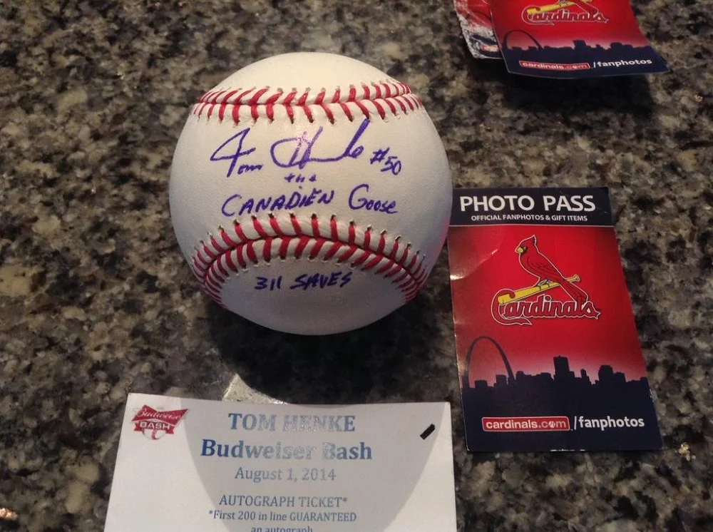 _ We know Tom Henke as “The Terminator” but apparently at some point during his career, people started calling him the “Canadian Goose.” I didn’t know this until I discovered this inscription on a baseball autographed by him. Presumably this nickname was dreamed up because he was a fireball closer like Goose Gossage that was pitching north of the border. It’s actually pretty creative, but I still prefer “The Terminator.”