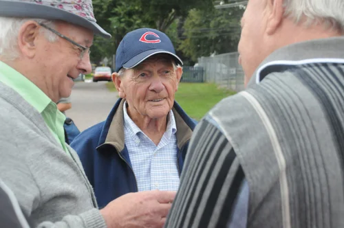 Hank Landry (centre) with former teammates Gerald Keough and George Dalton after the ceremony officially naming Legends Field in Summerside, PEI, in honour of Landry and other baseball stars. Photo: Brett Poirier/Journal Pioneer.