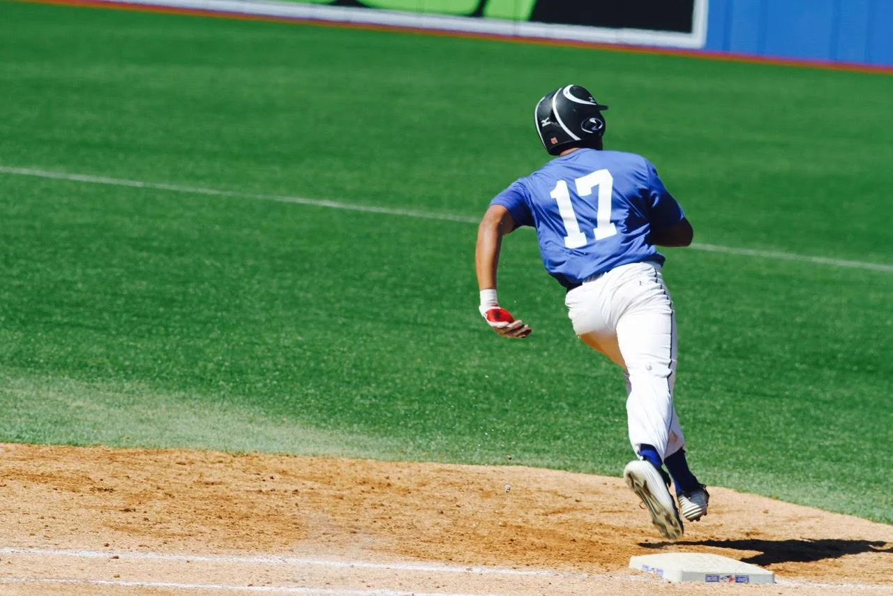 OF Isaac Deveaux barrels around first base during Tournament 12 play at the Rogers Centre. Photo: Tyler King.