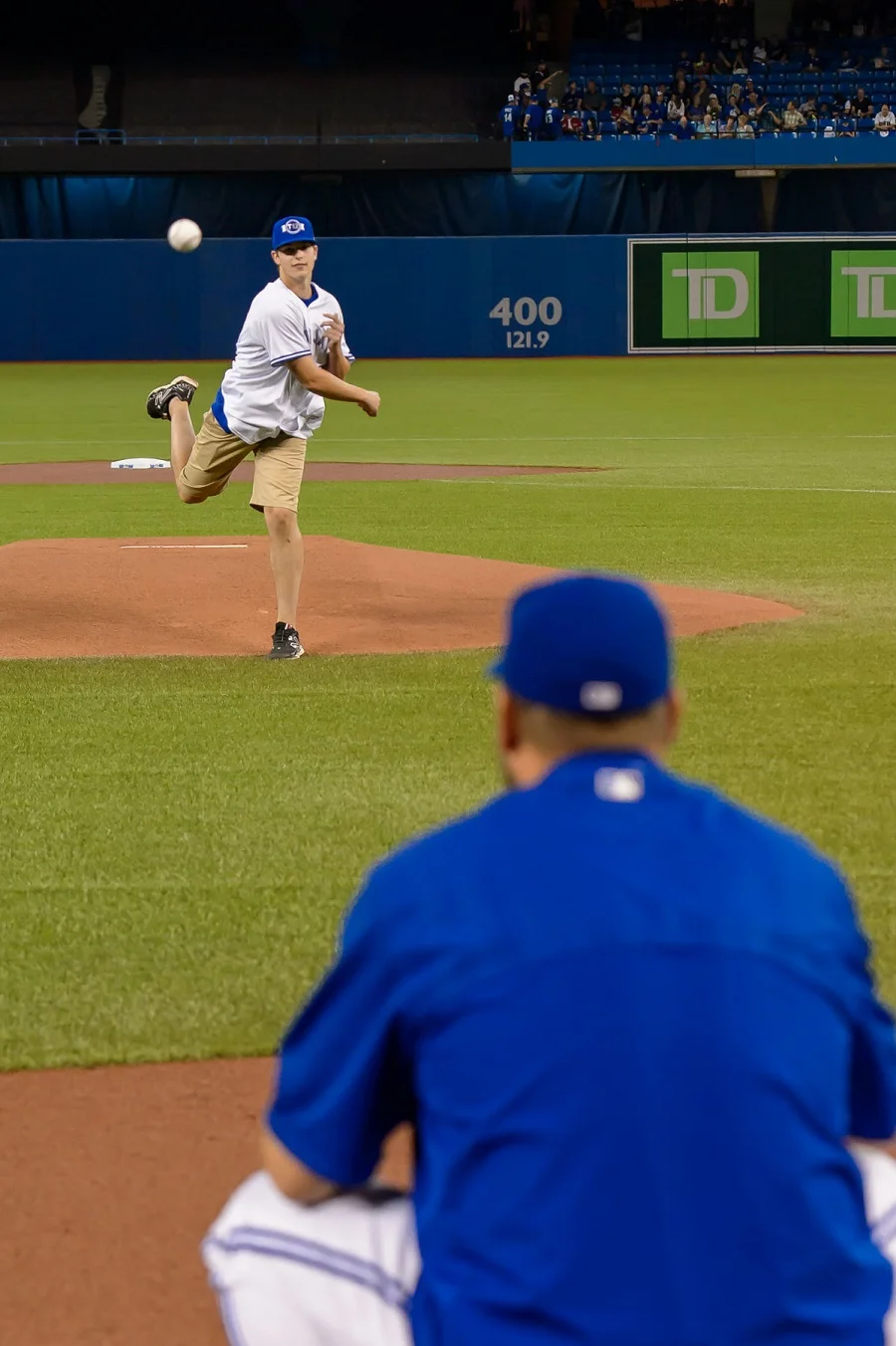 Prairies MVP Carson Perkins (2-0) threw out the first ceremonial pitch to Blue Jays LHP Mark Buehrle before the Boston Red Sox-Jays game Friday night. Photo Michelle Prata.