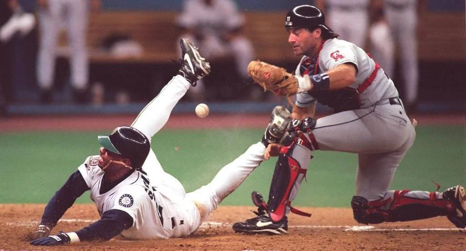 Seattle Mariners CF Ken Griffey scores dislodging the ball from California Angels C Greg Myers.