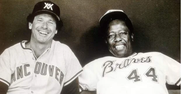 Wayne Norton and Hank Aaron relax during the 1983 Legends Game at BC Place Stadium.