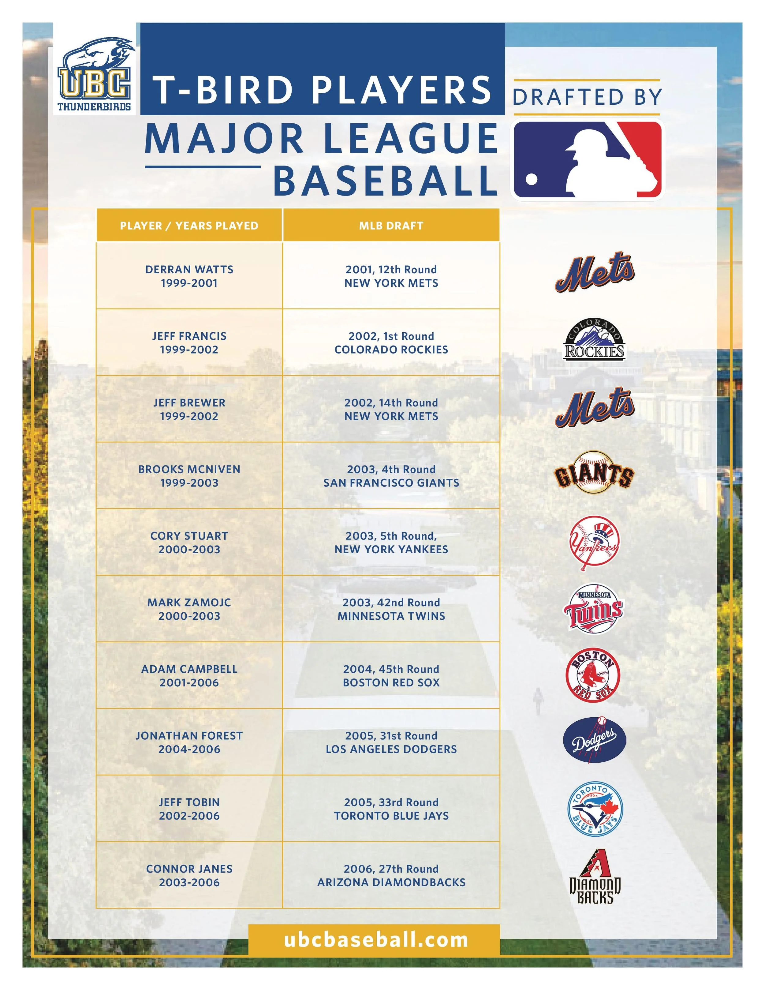 The University of British Columbia's baseball program has consistently produced MLB draft picks since 2001. The school's most famous draftee is Jeff Francis who recently retired after an 11-year major-league career.