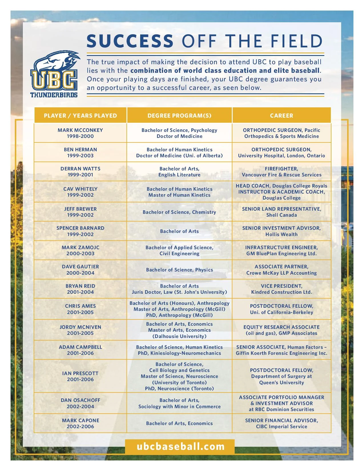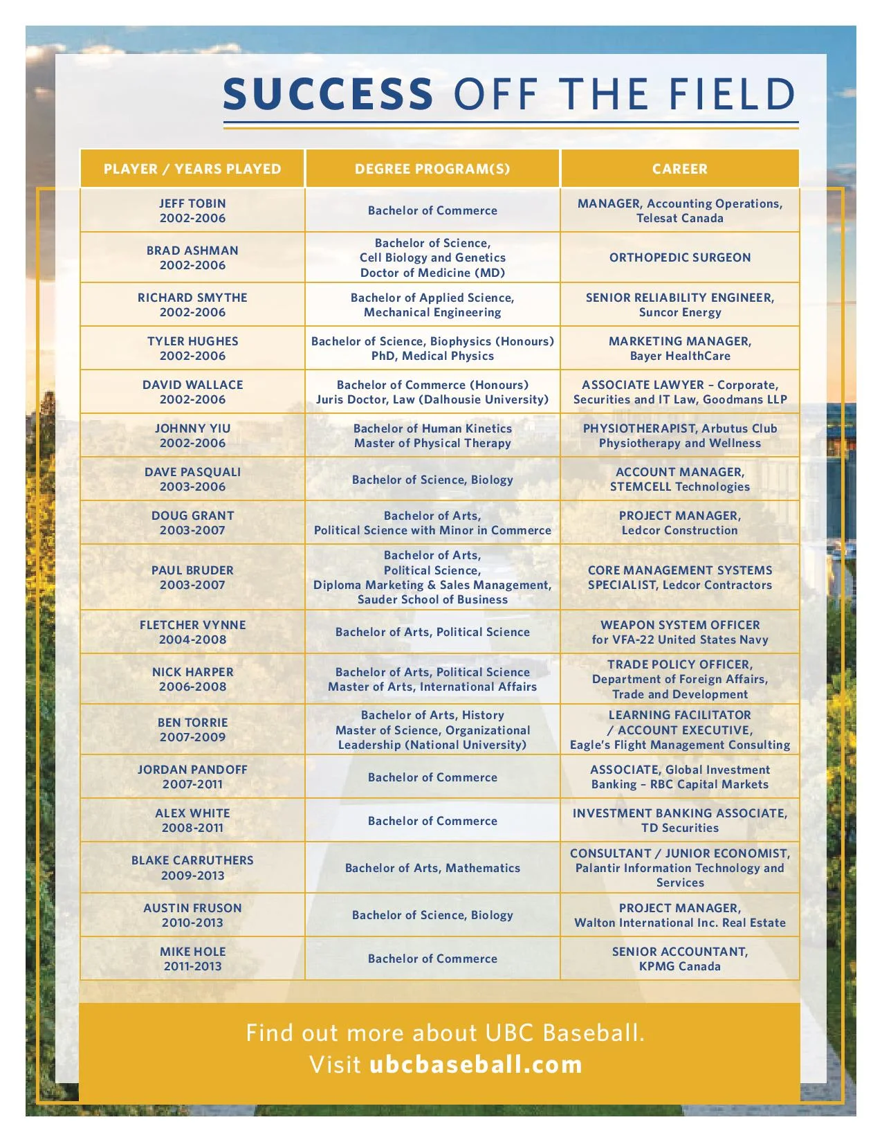 A list of notable alumni who've excelled after leaving the baseball diamond behind compiled by UBC alumni: