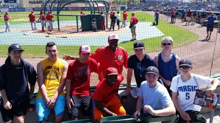 Washington Nationals manager Dusty Baker takes time out during batting practice to say hello to the Etobicoke Rangers 15U. before the Florida Marlins hosted the Nats in Jupiter, Fla.