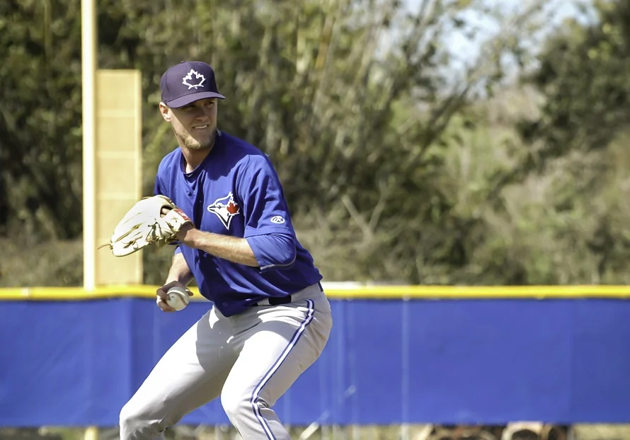 Toronto Blue Jays RHP Jonathan Harris gets set to fire a ground ball to first base during pitcher’s fielding drills spring training in Dunedin, Florida. Photo: Braydon Holmyard.