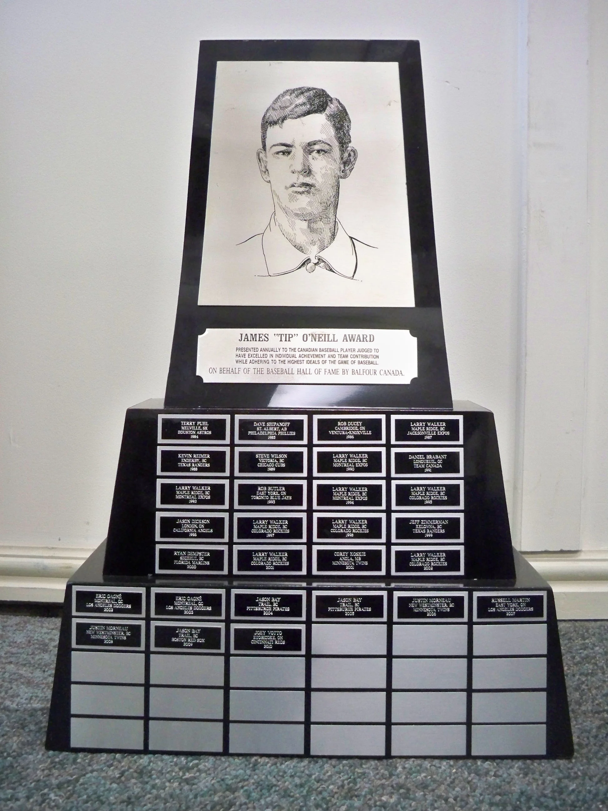 The Hall’s Tip O’Neill Award is named after Woodstock, Ont., native James “Tip” O’Neill, who was one of Major League Baseball’s first legitimate stars. With the American Association’s St. Louis Browns in 1887, O’Neill set big league records in hits, doubles, slugging percentage and total bases, while compiling a major league record .492 batting average. Walks were counted as hits in 1887, but if O’Neill’s average was calculated by today’s standards, it would be .435, the second highest in big league history to Hugh Duffy (.438).