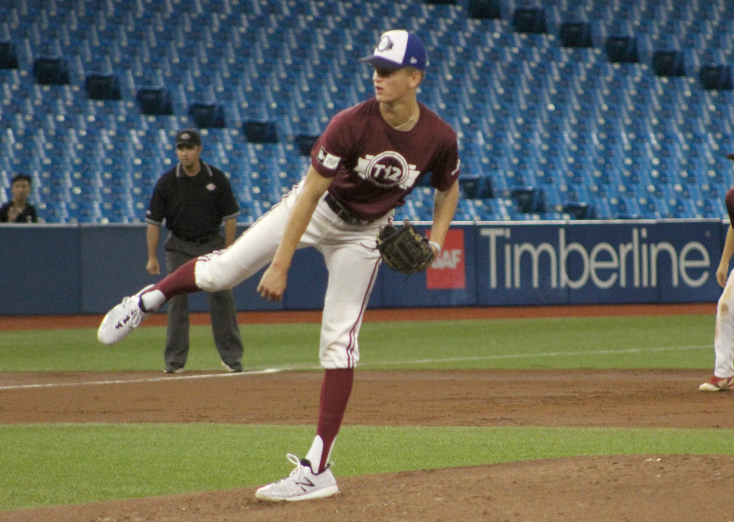Vauxhall Baseball Academy right-hander Levi Abbott (Lethbridge, Alta.) took advantage of his first and only start at Tournament 12 with a strong performance for Team Maroon. Photo: Joshua Howe/Toronto Observer