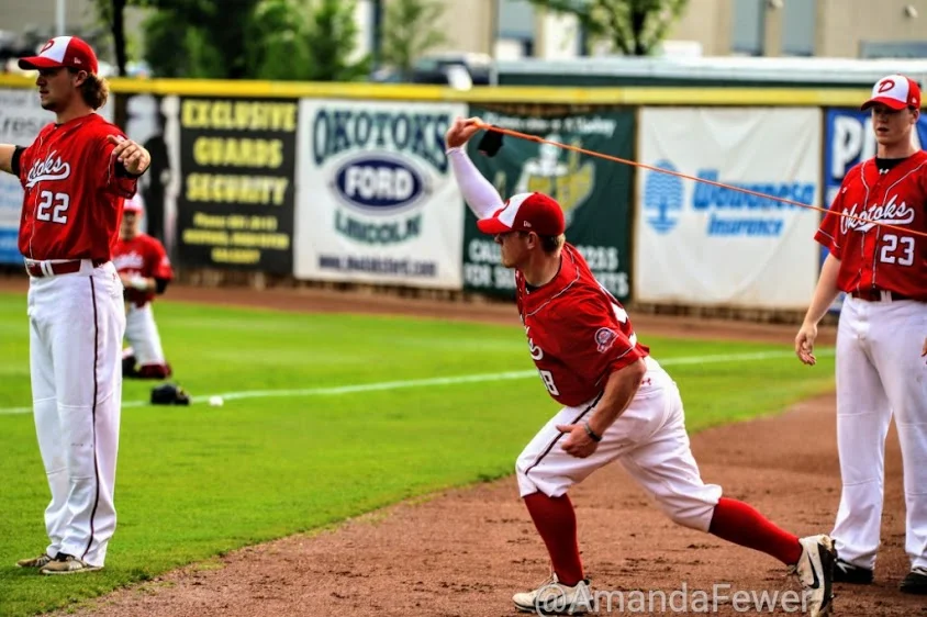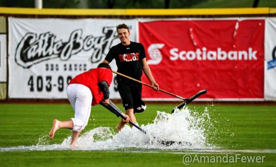 Coach Dave Robb showed players the proper way to lift a wet tarp ... "bend your backs." No less than 5,300 fans showed and stayed to see the Okotoks Dawgs meet Swift Current.