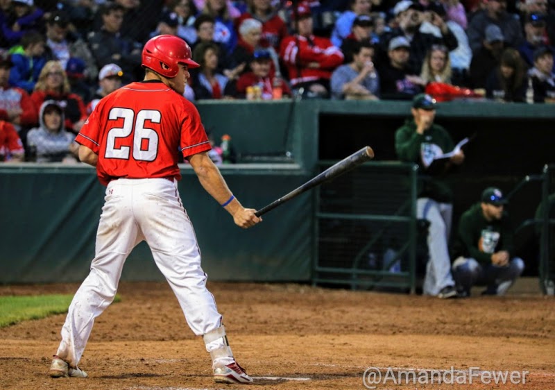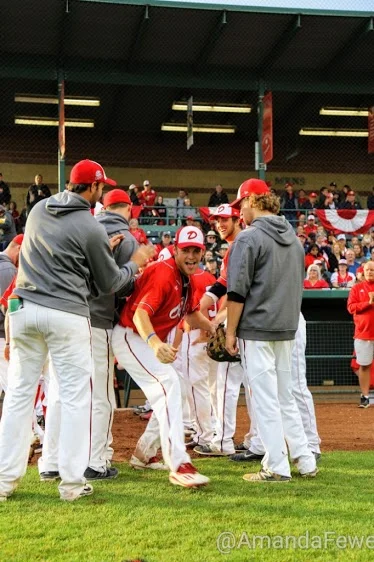 Ryan Humeniuk (13), Matt Lloyd (6) and Jayse McLean (24) meet at home plate for a post-run helmet bang.