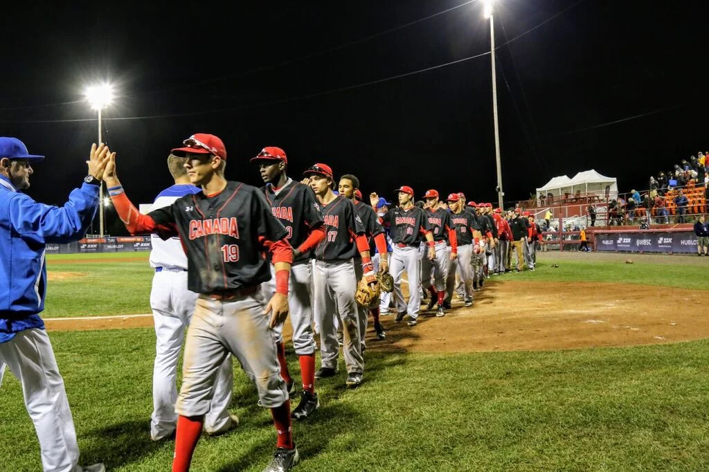 C Archer Brookman (Pointe-Claire Que.) of Académie Baseball Québec, talks with LHP Wesley Moore (Surrey, BC) of the Vauxhall Academy Jets grad, who picked up the win against Italy.