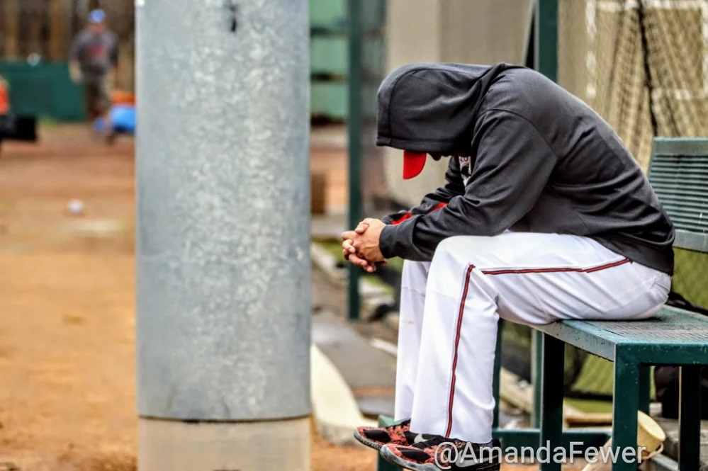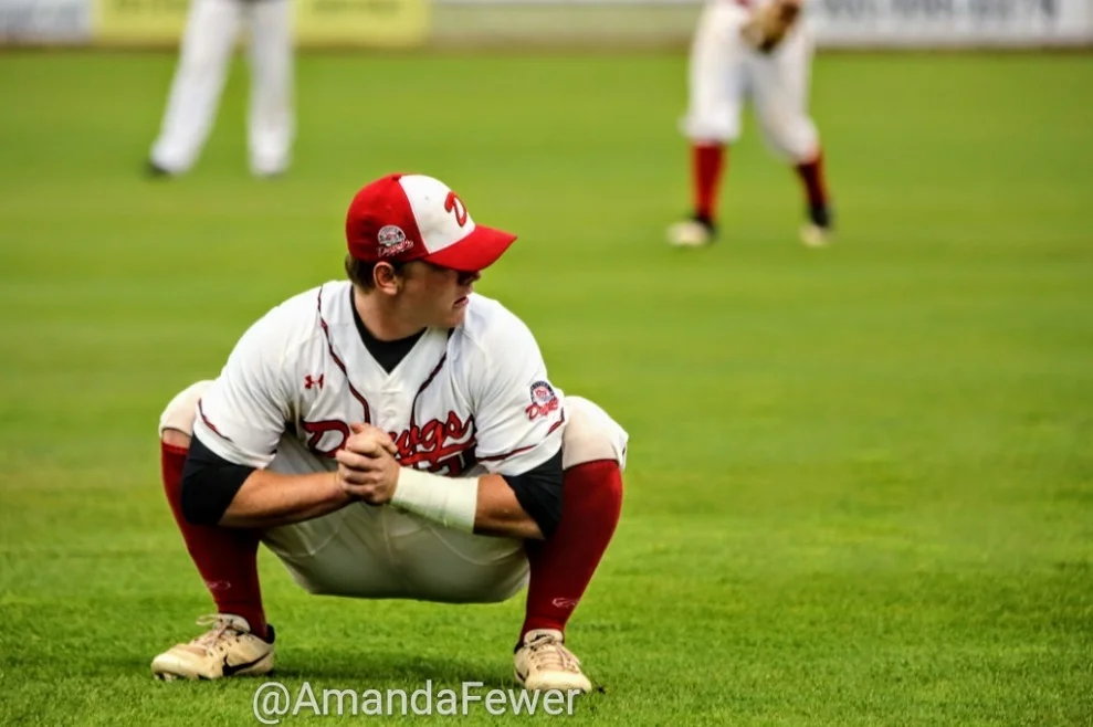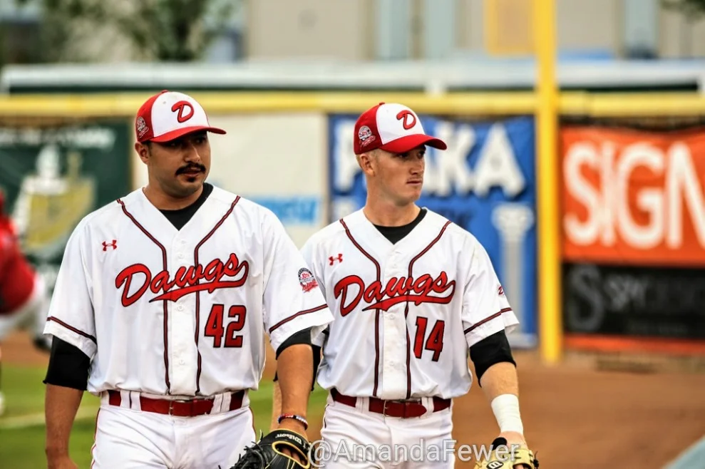 Anthony Balderas (42) and Joel Brophy (Burlington, Ont.) return to the Okotoks Dawgs dugout after finishing their bullpen session. Photos: Amanda Fewer.