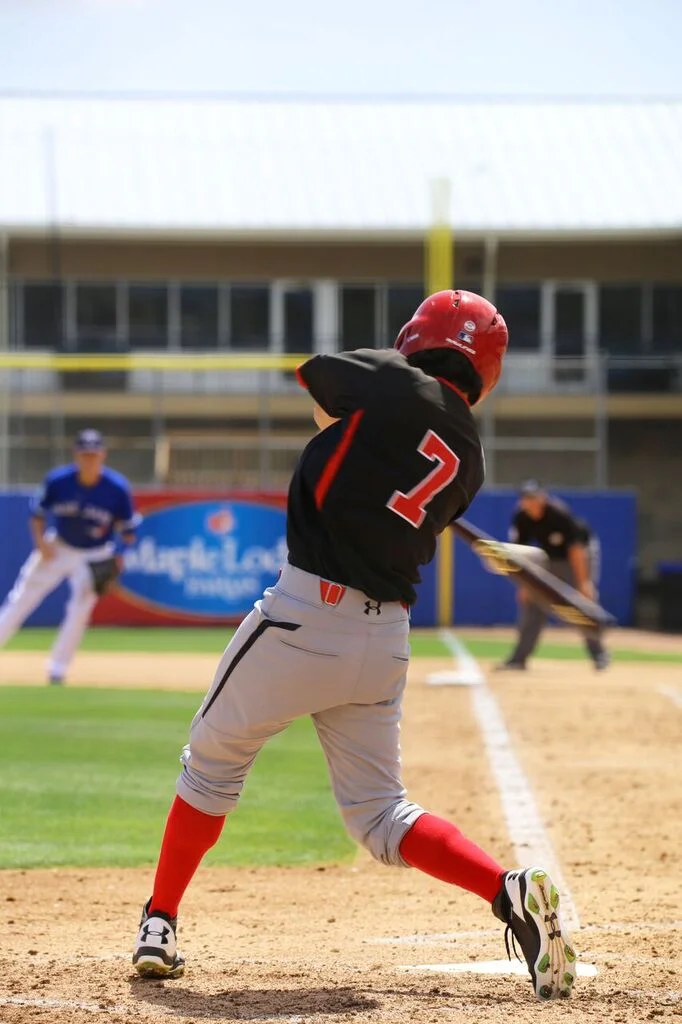 OF Clayton Keyes (Calgary, Alta.) of the Okotoks Dawgs, had a pair of doubles as Canadian high schhooler met the Blue Jays pros in Dunedin. Photos: Amanda Fewer.