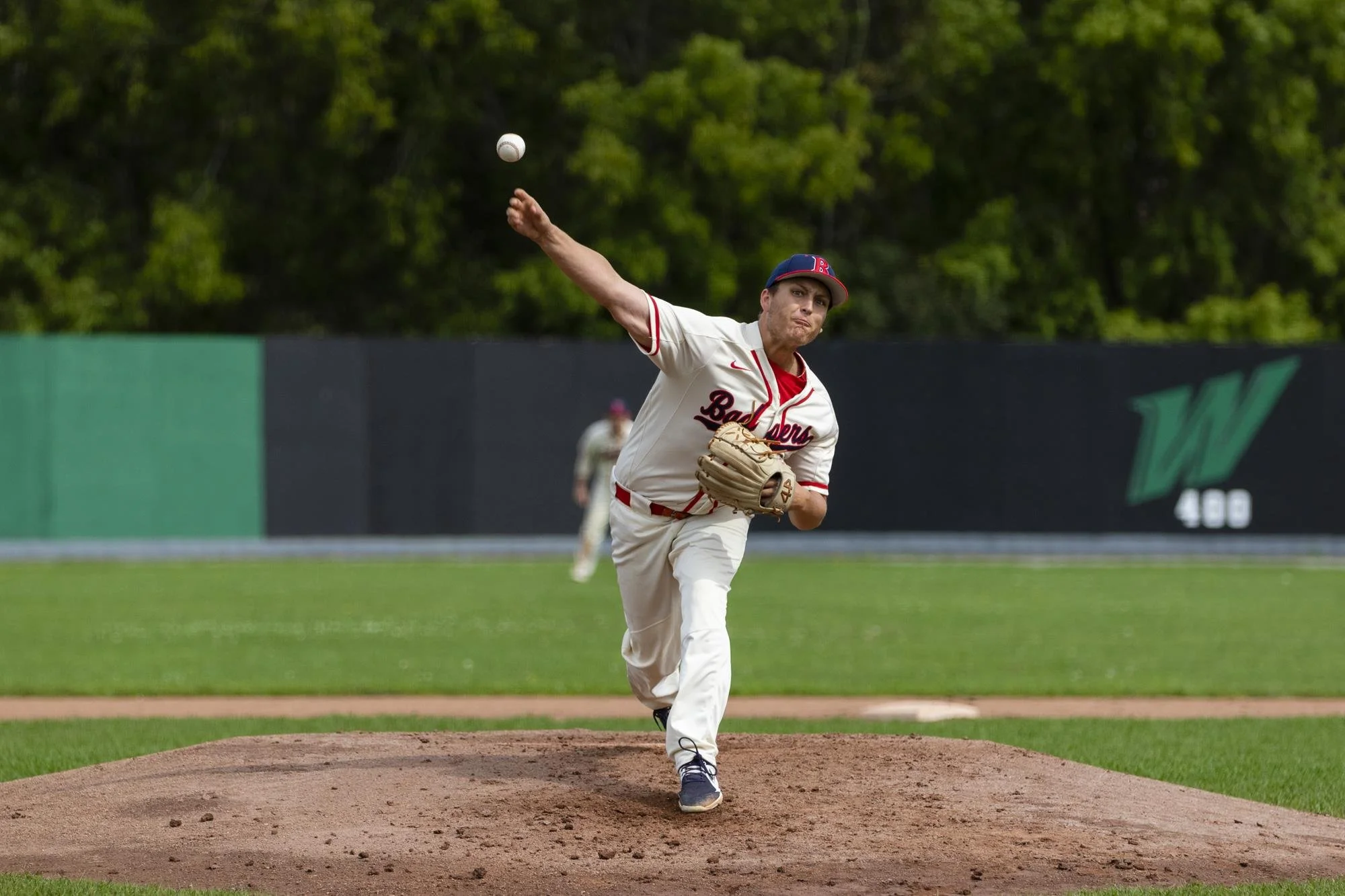 Former London Badgers RHP Connor Ambrogio (Dorchester, Ont.) pitched the Borck Badgers to victory over the McMaster Marauders in Game 1 of the Ontario University Athletics regionals in Niagara Falls last month en route to a nine-inning, complete game victory. Photo: Stephen Leithwood, Brock University