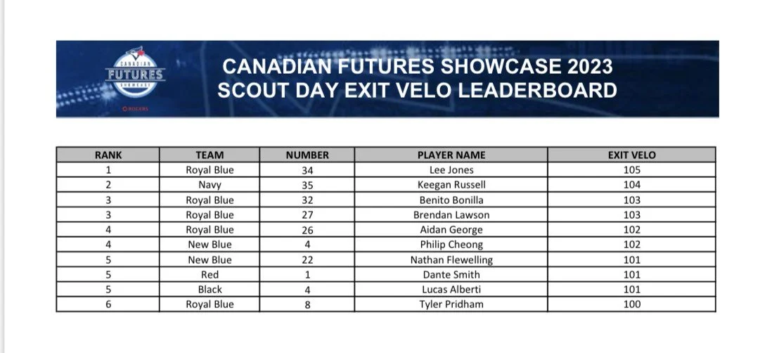 A list of the top exit velocities at the Canadian Futures Showcase from yesterday: