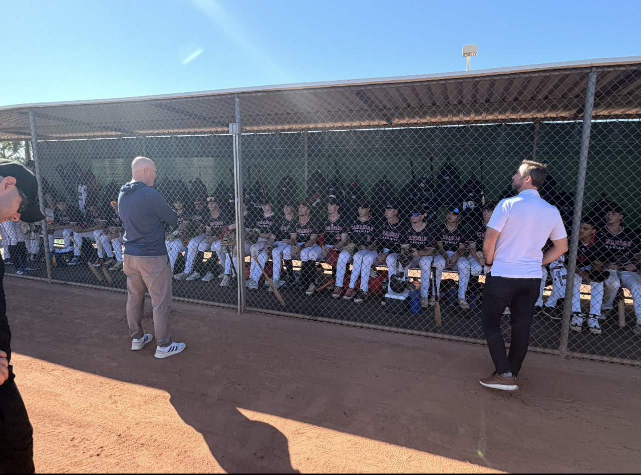 Former big leaguers Pete Orr (Newmarket, Ont.) and Taylor Green (Comox, B.C.), now part of the Milwaukee Brewers scouting staff, meet with the Canadian Premier players prior to Friday's game against the Langley Blaze. Photo: Canadian Premier Baseball League