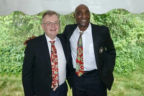 Canadian Baseball Hall of Fame inductee Bill Humber (left), shown here with fellow 2018 inductee Lloyd Moseby, founded Seneca’s Baseball Spring Training for Fans course in 1978.