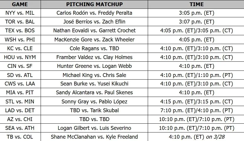 The 2025 Opening Day pitching matchups across the Majors feature:
