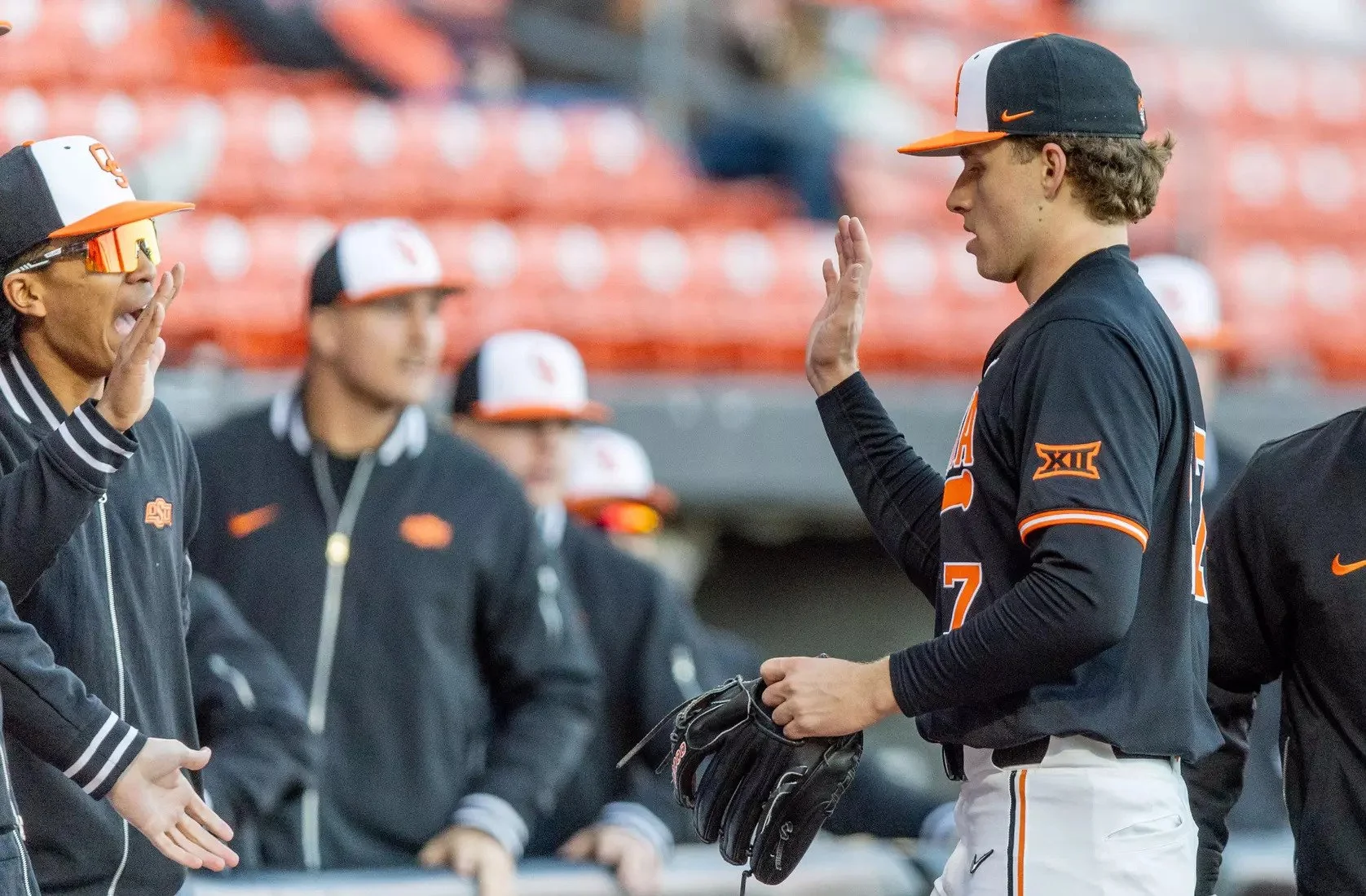 Ontario Blue Jays grad Matthew Brown (Carlisle, Ont.), far right, will pitch for the Oklahoma State Cowboys in the NCAA baseball tournament. Photo: Oklahoma State Athletics