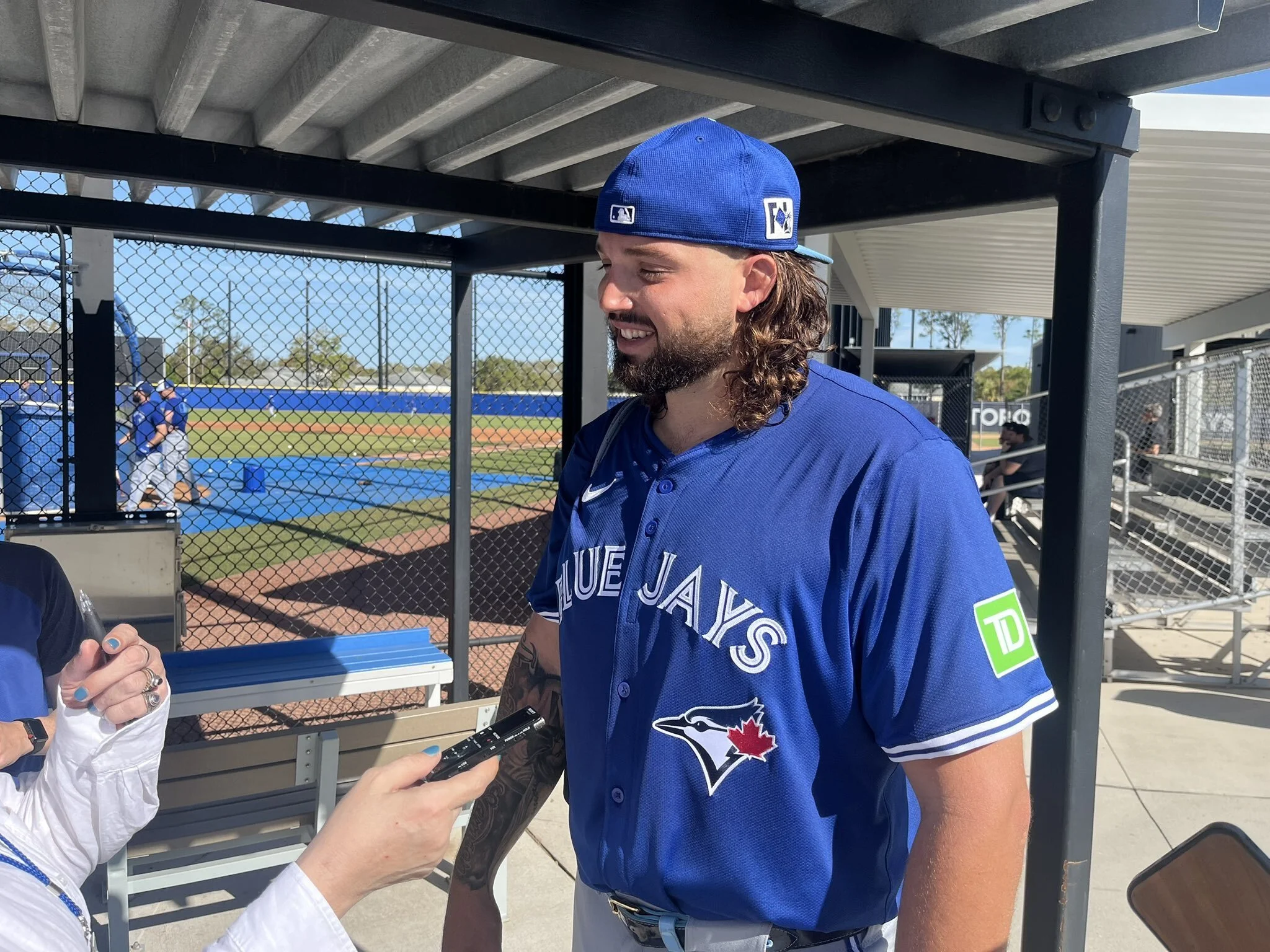 Toronto Blue Jays right-hander Alek Manoah speaks to reporters after throwing off the mound for the first time since his Tommy John surgery nine months ago. Photo: Matt Betts