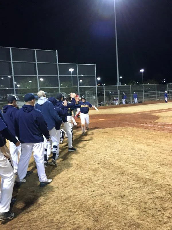 The Langley Blaze form a line to greet Rhys Cratty after a game-winning hit against the Minnesota Blizzard at a Las Vegas tournament.
