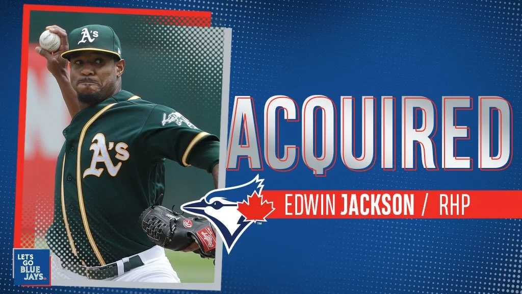 TORONTO -- A day after their bullpen went the distance in a 4-3 win over the Chicago White Sox, the Blue Jays and Oakland Athletics teamed up to send RHP Edwin Jackson to Toronto in exchange for cash considerations on Saturday.