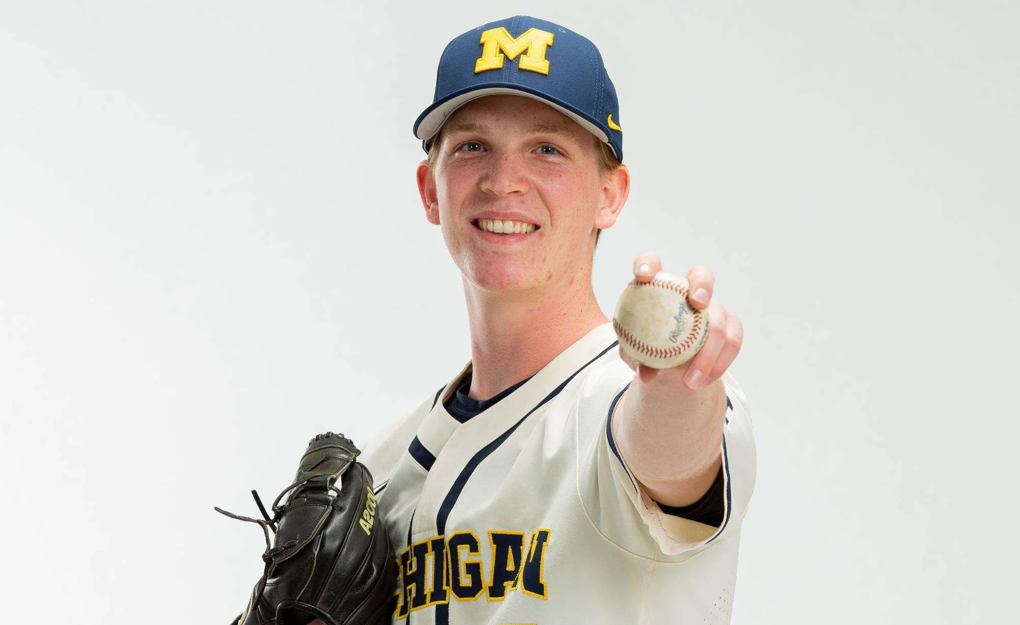 Ontario Terriers alum Connor O’Halloran (Mississauga, Ont.) allowed three earned runs and struck out six batters in 5 2/3 innings in his start for Michigan. Photo: Michigan Athletics