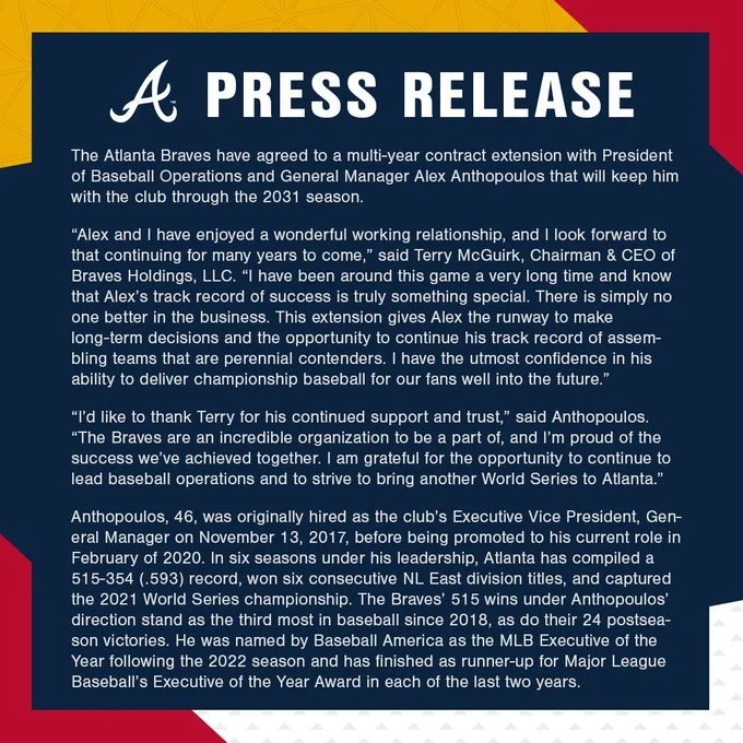 The Atlanta Braves have signed general manager Alex Anthopoulos (Montreal, Que.) to a multi-year contract extension.