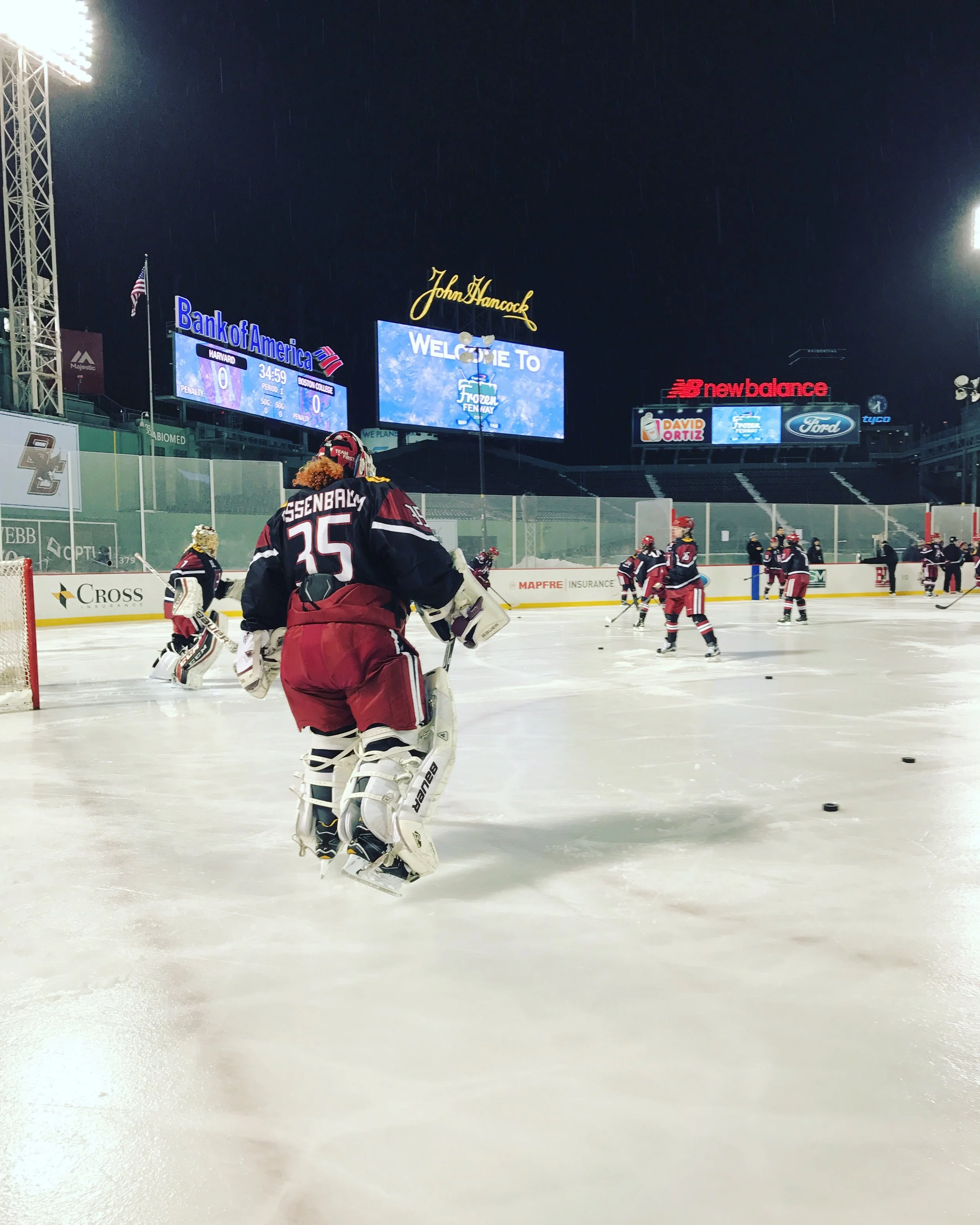 Last night I got to spend the evening at Fenway Park in Boston as my sister’s hockey team played in a Frozen Fenway game against Boston College. The weather was pretty awful, it rained most of the night, and her team lost, but I still found it to be a really cool event. I even got to skype with Gramma to help her feel like she was there since she had been put on the DL with a bad cold and couldn’t make the trip north for the game.