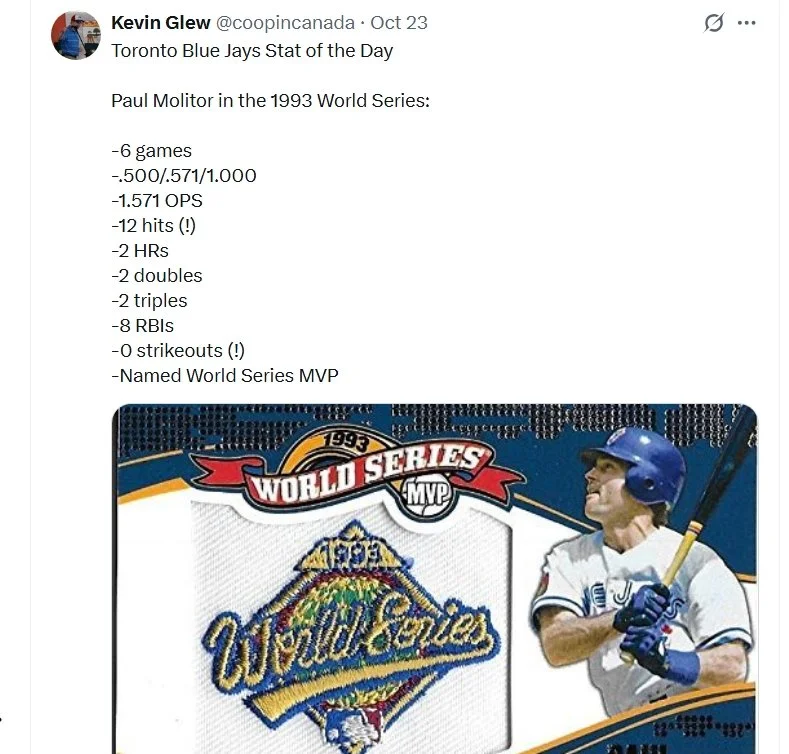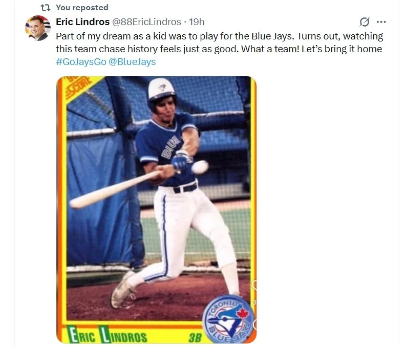 One of the most coveted sports cards of 1990 was the Score Traded card (see below) that pictured Philadelphia Flyers phenom Eric Lindros taking batting practice with the Blue Jays. Lindros evolved into a Hockey Hall of Famer, but as a kid, he dreamed of playing for the Blue Jays. Here’s an X post from him on Thursday: