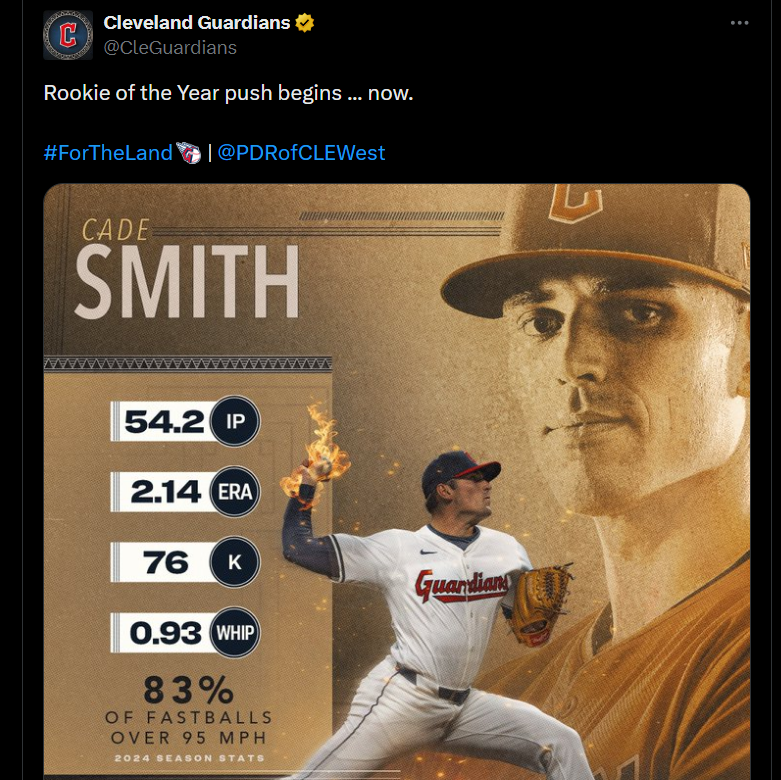 -The Cleveland Guardians have started a social media campaign (see photo above) to advocate for reliever Cade Smith (Abbotsford, B.C.) to be the American League Rookie of the Year. In 55 big league appearances this season, the Junior National Team and Abbotsford Cardinals grad is 6-1 with a 2.09 ERA and has struck out 78 in 56 innings. The 6-foot-5 right-hander will have some serious competition for the top rookie honour. Baltimore Orioles outfielder Colton Cowser is seen as the favourite heading into the season’s final month and a half. A strong case could also be made for New York Yankees right-hander Luis Gil and Oakland A’s closer Mason Miller. No Canadian has ever won the American League Rookie of the Year Award. Jason Bay (Trail, B.C.) captured the National League honour in 2004.
